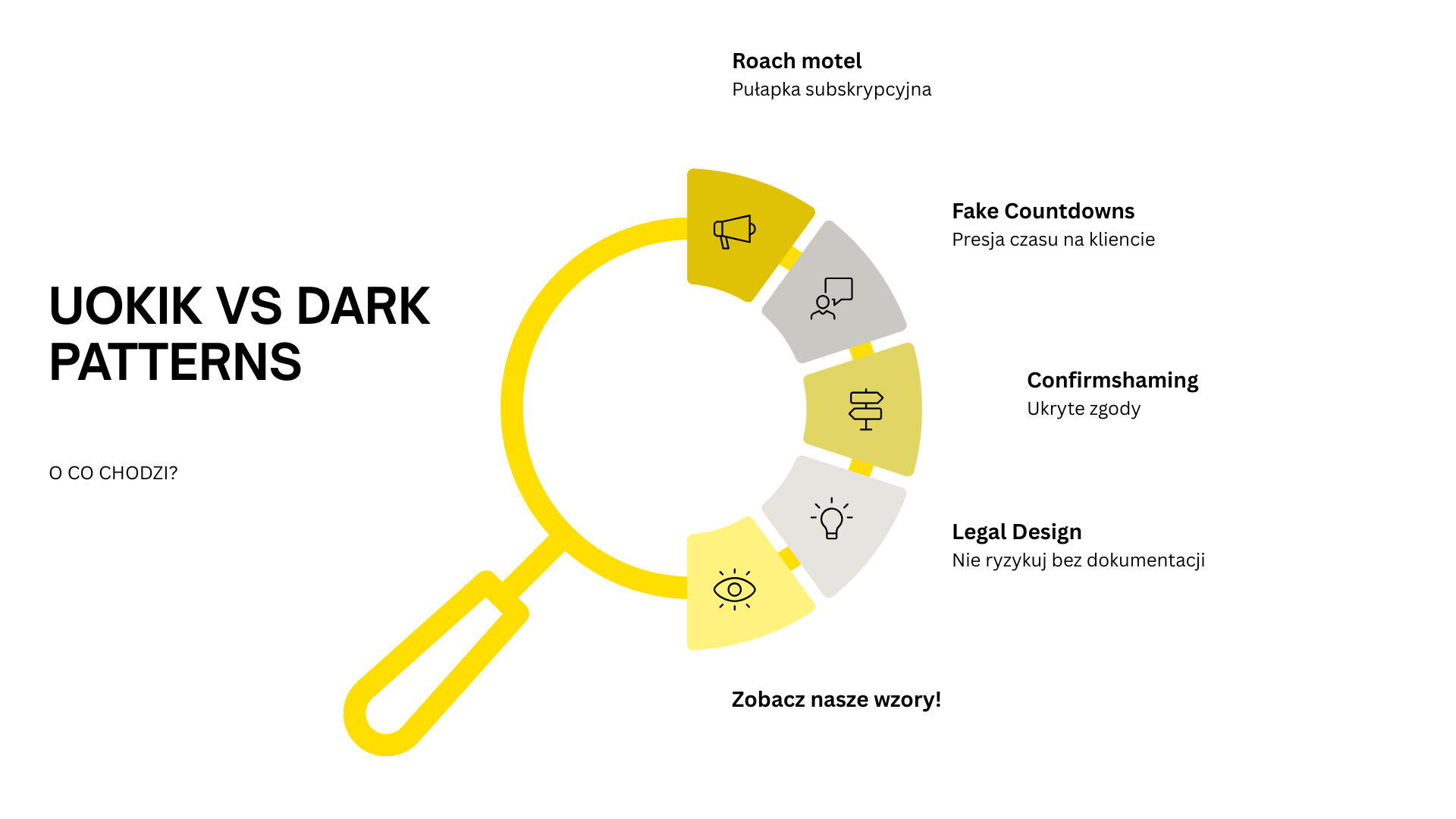Mroczne wzorce to celowe zabiegi w architekturze strony (UX/UI), które mają na celu manipulację użytkownikiem. Zmuszają go do zrobienia czegoś, czego wcale nie planował – od nieświadomego dodania ubezpieczenia do koszyka, po wyrażenie zgody na śledzenie marketingowe.